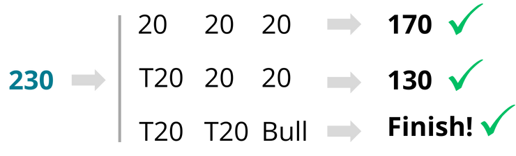 230 is the easiest example. Throw 3×20 and you are on 170. If you throw at least 1 triple you have 130 (a possible bull shot), 90 (idem, a possible bull shot) or 50 left.