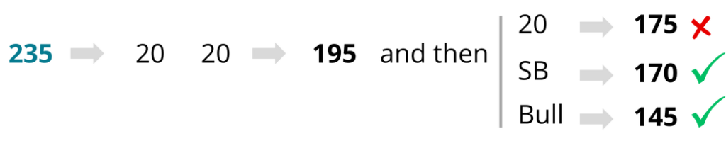A golden tip: use the whole board to count towards 170! If you are on 235 and you throw 2×20, the 3rd dart should ALWAYS go towards the bull. Single bull brings you to 170, bull brings you to 145. If the 3rd dart again goes towards 20 here, you leave 175, which you cannot check out in 3 darts.