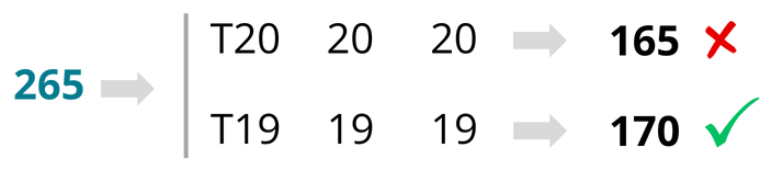 A next nice example is 265. This is a number where you must not start on the 20. The first dart should always go towards 19. 1 triple towards 19 gives you a score of 95. 265 − 95 is… indeed 170!